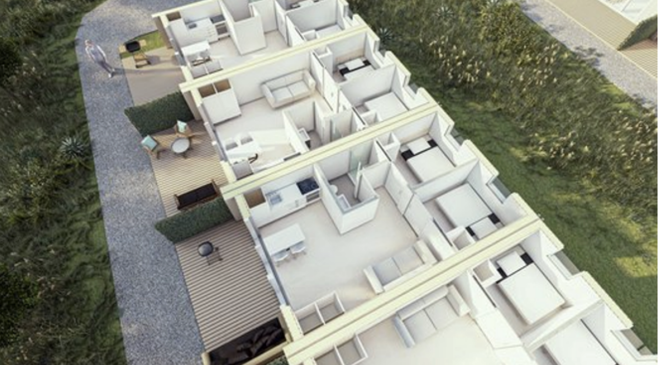 Die Wohnungen verfügen über zwei Schlafzimmer mit Doppelbetten sowie einen offenen Wohnbereich mit Küche und Essplatz und ein Badezimmer.